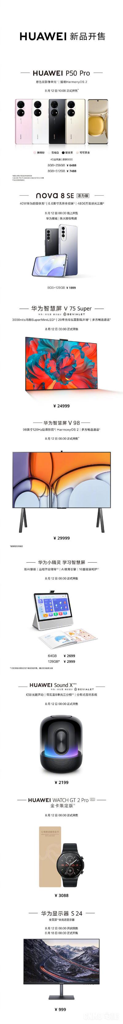 在此前的P50系列发布会上,华为除了正式发布了P50系列新机,还一口气推出了多款新品,包括nova8 SE活力版、华为智慧屏V 75 Super、智慧屏V 98、华为小精灵学习智慧屏、华为Sound X、华为WATCH GT 2 Pro、华为显示器S 24等。8月12日,这些新品统统迎来了首销。现在通过一张图来了解下这些新品的售价。