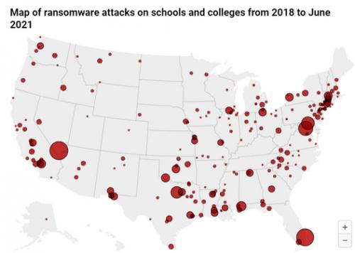 根据Comparitech的统计,去年美国有1740所中小学和大学因勒索软件攻击受到影响,波及学生140万,同比增长67%。Comparitech有过统计,从2018年1月到2021年6月,美国有222起针对中小学和大学的独立勒索软件攻击案例,影响3880所学校和近300万名学生,损失恐怕难以估计。