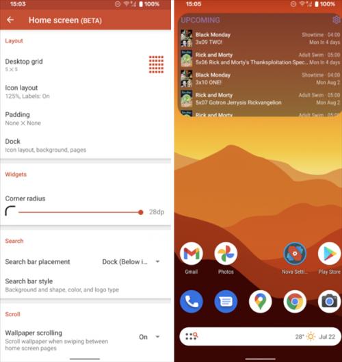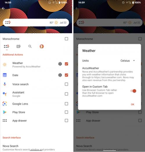 三方桌面启动器最大的优势就在于强大的可自定义功能,像是图标样式、APP名字这都不用说。在nova launcher 7上,天气可集成在搜索框右侧,桌面插件的圆角弧度也支持自定义调节,新的向下滑动手势等。