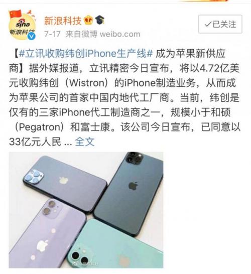 2020年7月,在苹果扶持下立讯继续扩张之旅,以33亿元收购纬创中国的iPhone制造业务,从AirPods耳机正式杀入iPhone组装业务。