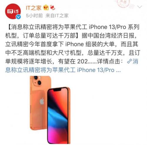 从台媒报道来看,立讯今年代工的iPhone新机订单,出货量将达1000万支,而且大部分是大尺寸的Pro机种,苹果刻意扶持之意尽显。