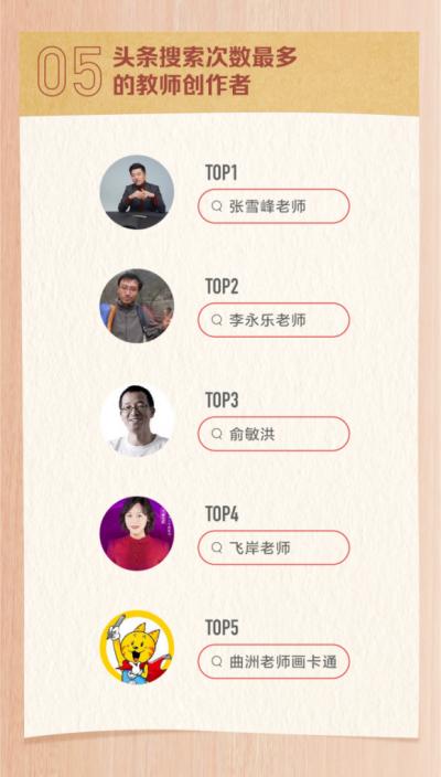 据了解,今日头条上的教师创作者也在持续生产优质内容,涉及数学、语文、英语、考研、历史、绘画、心理等多个领域。数据显示,张雪峰老师、李永乐老师和俞敏洪是头条搜索次数前三的教师创作者。