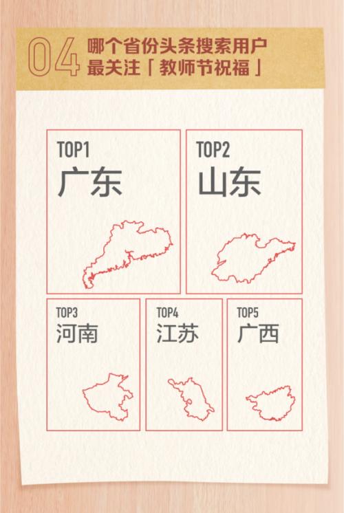 报告指出,关于教师节,头条搜索次数最多的关键词,包括“教师节祝福语”“教师节贺卡制作”和“教师节图片”。“祝福语”成今年教师节最热关键词。其中,广东、山东和河南的头条网友最关注“教师节祝福语”怎么写。