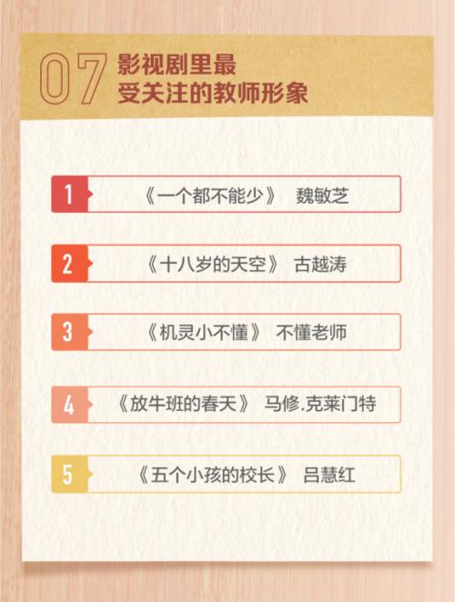 此外,报告还呈现了国内外影视作品中最受关注的教师形象。热门第一位是电影《一个都不能少》女主人公魏敏芝老师,随后是电视剧《十八岁的天空》中的古越涛老师、《机灵小不懂》中的不懂老师、《放牛班的春天》里的马修.克莱门特以及《五个小孩的校长》里的吕慧红。