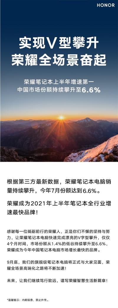 多家第三方数据显示,荣耀正在重回市场中央,快速夺回失去的份额,重启冲顶之路。截至8月底,荣耀手机中国区市场份额已达16.2%,比肩其此前巅峰期的市场份额高点。另据第三方数据分析,在“1+8+N”智慧全场景战略推动下,荣耀笔记本仅4个月时间,就从1.4%的市场份额回升至7月的6.6%,成为2021年上半年全行业增速最快品牌。618期间更是佳绩不断,荣耀笔记本全平台销量在一小时内破万,并成为京东、天猫等平台销量和销售额的双料冠军。