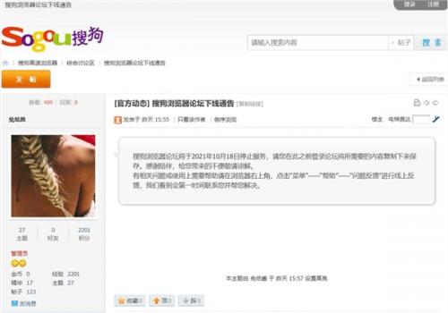 9月18日消息,据媒体报道,搜狗浏览器论坛管理员近期发布搜狗浏览器论坛下线通告。