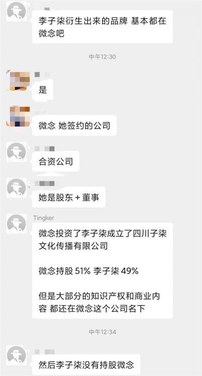 截图还指出,李子柒大部分知识产权和商业内容都在微念公司名下,若她与公司闹掰了,连账户把控权都没有。聊天记录中甚至有人建议,不要在注册资本很大的公司做小股东,另外不要合伙,自己单干最合适。