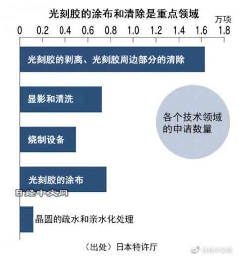 半导体制造的前工序中,核心是光刻工序,根据以光刻设备烧制的电路图切削基板、进行布线,完成半导体芯片制造。调查数据显示,半导体光刻的前后处理技术领域的申请最多,光刻胶的剥离、光刻胶周边部分的清除技术数量超1.6万项。