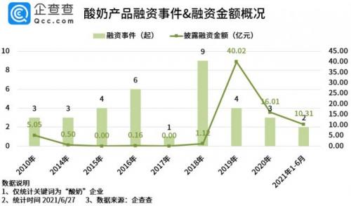 企查查数据显示,截至目前我国共有22个酸奶品牌拿到融资,总融资事件达35起,披露融资金额达73.16亿元,其中2018年为融资高峰期,共发生9起融资事件,2019年融资金额为历年第一高,达到40亿元。2021年至今已有2起融资,分别是“简爱酸奶”和“一只酸奶牛”。