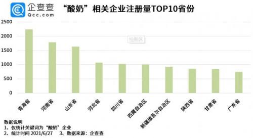 企查查数据显示,从酸奶企业的省份分布来看,西部省份诸如青海、西藏、新疆均榜上有名,尤其是青海,以2249家位列第一。此外,河南、山东也是酸奶企业大省。