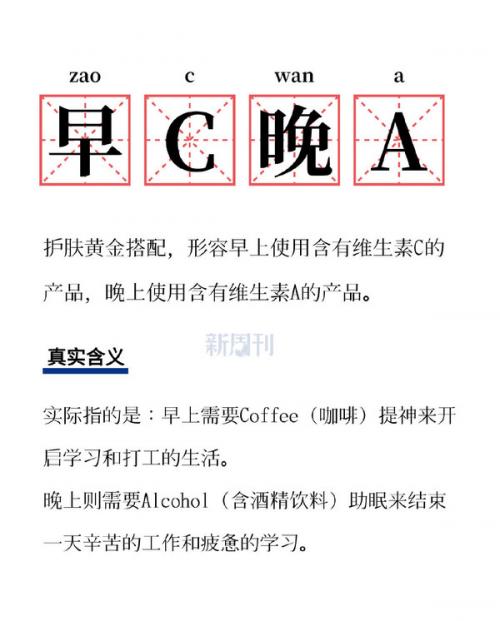 据悉,早C晚A原本是用来表示护肤的黄金搭配,早C指的是维生素C产品,晚A则指的是维生素A产品,有抗衰、美白的作用。因此,精致的猪猪女孩应该是有所了解的。不过,现在“早C晚A”有了新的解释。