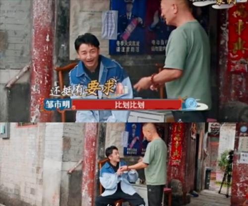 原来,邹市明是在参加一个综艺节目,在北京一个胡同,有一位老大爷想和邹市明合影,并表示“你上场净打别人了,你歪在那里,我拿拳头笔划一下。”邹市明也非常配合地“被KO”了。