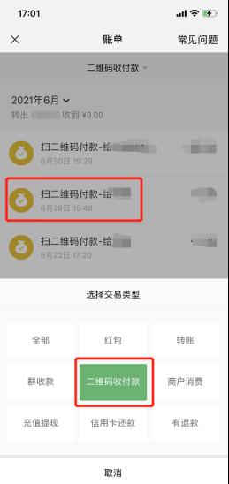 第二步:选择全部交易类型→二维码收付款→在这里找到你要联系的商家。