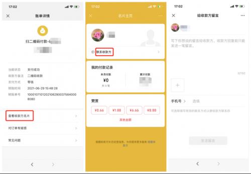 第三步:点击查看收款方名片然后联系收款方,在留言中写下你的诉求并填写上你的联系电话就可以了。