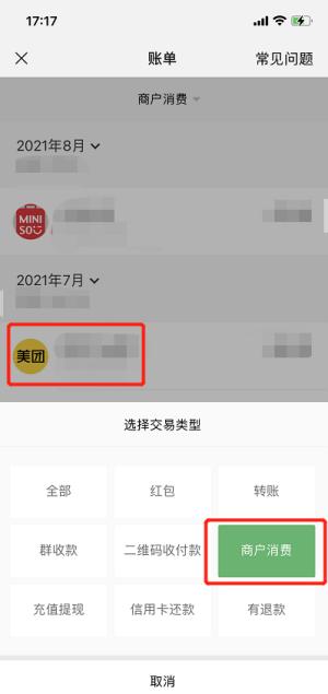 第二步:选择全部交易类型→商户消费→在这里找到你要联系的商家;