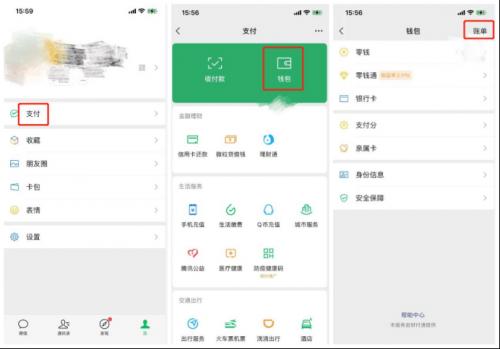 第一步:打开微信,依次点击我→支付→钱包→账单;