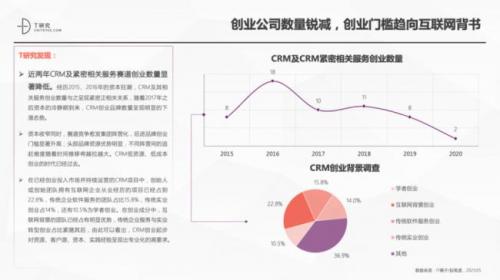 - 近两年CRM及紧密相关服务赛道创业数量显著降低。经历2015、2016年的资本狂潮,CRM及其相关服务创业数量与之呈现紧密正相关关系,随着2017年之后资本的冷静期到来,CRM创业品牌数量呈现明显的下滑态势。