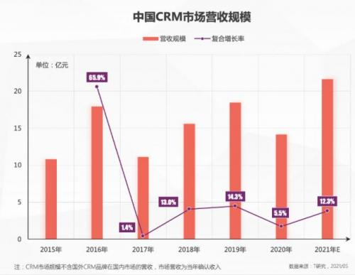 - 2021年国内CRM市场销售规模预计超21亿,CAGR重回10%以上,CRM已经完全走出疫情怠速区;