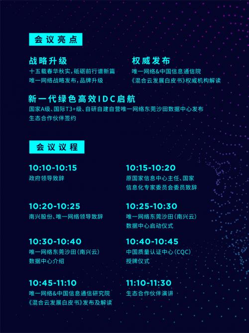 大会邀请了多位相关部门领导、专家大咖、行业精英,启动唯一网络东莞沙田(南兴云)数据中心,解读、分享最新产业走向以及行业趋势,将对相关企业在新形式与新政策下的发展带来一定的思路。并且,大会还为与会者准备了福利。