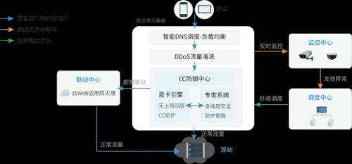 应用保采用全新的分布式防御架构,基于秒级的即时调度,能够快速完成流量转移和清洗,并联动云Web应用防火墙,精准拦截各类网络攻击,实时监测高危漏洞并及时下发补丁。实践证明,应用保的安全架构能够轻松地应对大规模和高并发的DDoS/CC和Web攻击,为用户业务提供多维度防护服务。工作技术原理如下图所示: