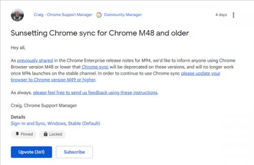 谷歌官方称,如果想要继续使用Chrome的同步功能,用户需要将浏览器更新到Chrome 49或更高的版本。