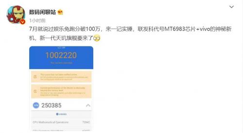临近年末,各家手机芯片厂商的新品发布可以说是年度压轴大戏,相关的消息和讨论也越来越多。就在今天,微博数码大V数码闲聊站曝光了联发科下一代天玑旗舰芯片的性能跑分,安兔兔跑分首次突破100万大关,并爆料称:“7月就说过娱乐兔跑分破100万,来一记实锤,联发科代号MT6983芯片+vivo的神秘新机,新一代天玑旗舰要来了。”