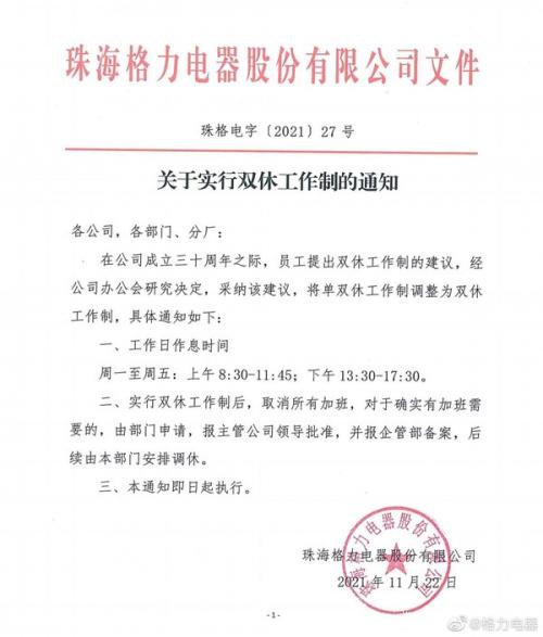 11月22日,格力电器官方发博表示,在公司成立三十周年之际,采纳员工提出双休工作制的建议,即日起将实行双休工作制,取消所有加班,对确实有加班需要的,需申请备案等。消息公布后,董明珠自媒体官微转发称:“以后咱就是双休人啦。”