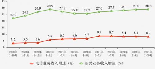 具体上看,1―10月份电信业务收入累计12252亿元,同比增长8.2%;三家基础电信企业的固定数据及互联网业务收入为2141亿元,同比增长11.3%;三家企业的固定语音和移动语音业务收入分别为191亿元和974亿元,同比分别下降7.9%和5.8%。