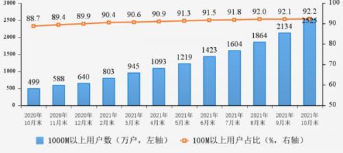 从用户量上看,截至10月份末,三家基础电信企业的固定互联网宽带接入用户总数达5.31亿户,比上年末净增4792万户。其中,100Mbps及以上接入速率的固定互联网宽带接入用户达4.9亿户,占总用户数的92.2%。