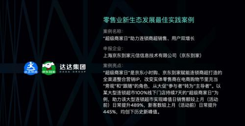 对于获奖案例“超级商家日”,CCFA是这样总结的:“超级商家日”是京东小时购、达达集团旗下京东到家赋能连锁商超打造的全渠道整合营销IP,改变实体零售商在电商购物节里充当“旁观”和“跟随”的角色,从大促“参与者”转为“主导者”。