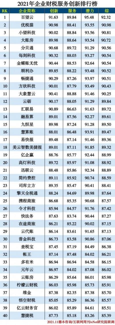 近日,《互联网周刊》发布“2021年企业财税服务创新排行榜”,通过创新、服务及潜力三大维度的综合评定,百望云以综合评分第一位列榜首。