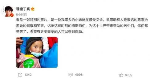 中关村在线消息:2021年12月3日——自成为家乡的旅游大使之后,丁真一直在不遗余力地为理塘、甘孜州旅游宣传贡献力量。今天,丁真再次发布了一条跟家乡有关的微博,但这条微博的内容无关旅游,而是感谢为自己家乡做义诊的医生们。微博的配图是一个得到高原义诊救助的唇腭裂女孩,小女孩充满希望的眼神打动了众多网友。