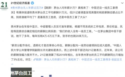 此外,还有茅台集团中层干部爆料:自己在公司干了这么多年,每年扣除税收都是四五万元,一年到手也就二十万元。中国人民大学公共管理学院副院长许光建认为:薪资分配市场化、透明化才是改革核心所在,薪酬分配向一线劳动者倾斜应成大趋势。