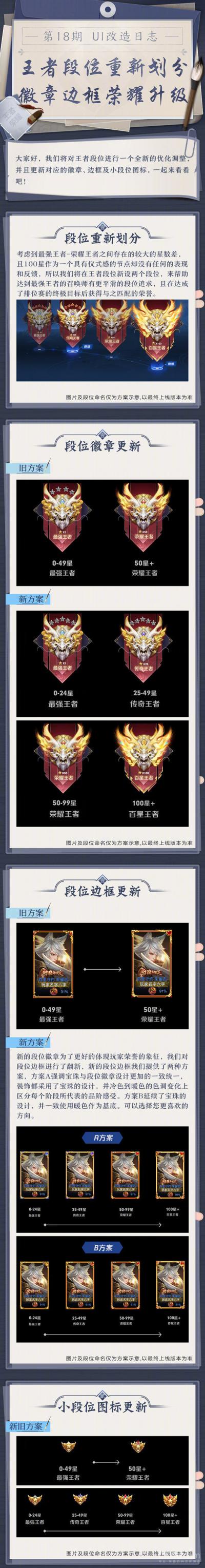 从官方信息来看,《王者荣耀》的王者段位将进行全新的优化调整,在王者段位新设两个段位,来帮助达到最强王者的玩家有更平滑的段位追求,并且,在达成了排位赛的终极目标后能够获得与之匹配的荣誉。新增的两个段位分别是传奇王者和百星王者,前者位于最强王者和荣耀王者两个段位之间,后者则如名字所言,需达到王者100星,成为新的最高段位。