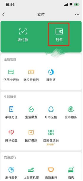 第1步:进入微信,点击【我】,点击【支付】-【钱包】;