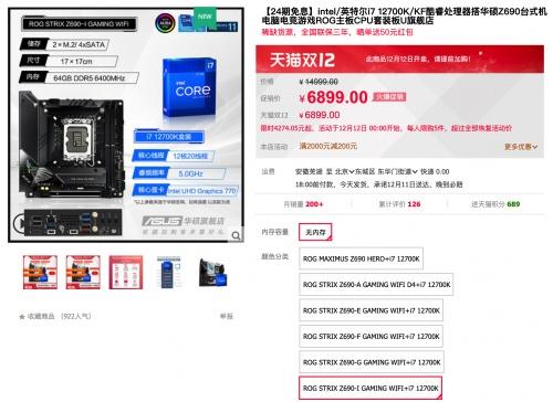 且天猫商城还有ROG STRIX Z690-I GAMING WIFI主板搭i7-12700K处理器套包,天猫双12火爆促销价6899元,还可享24期免息福利。购买链接:https://detail.tmall.com/item.htm?id=656153165517&skuId=4912548910787