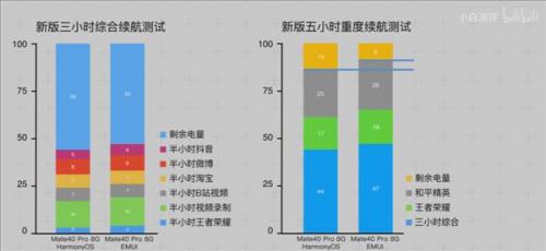 整机续航方面,在5小时重度续航中,分别进行了3小时抖音、淘宝、微博使用,以及两款热门手机游戏《和平精英》和《王者荣耀》各一小时后,HarmonyOS 2剩余14%,EMUI 11剩余9%,高下立判。