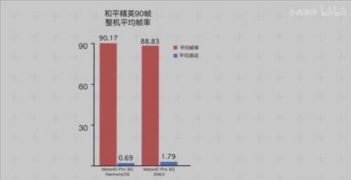 来看游戏表现实测数据,《和平精英》90帧模式整机平均帧率:HarmonyOS 2为90.17帧,平均波动0.69,功耗3.77W。作为对比,EMUI 11平均88.83帧,平均波动1.79,功耗3.86W。