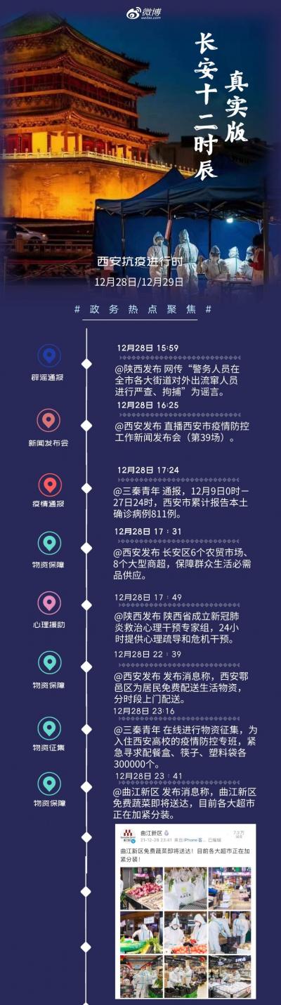 12月23日, @陕西发布、@西安发布、@三秦青年等当地政务官微率先行动,及时发布新增病例情况、“封城”消息、考研信息等内容,@微博政务迅速建立陕西政务协作群,重点推荐相关内容,助力信息分发。