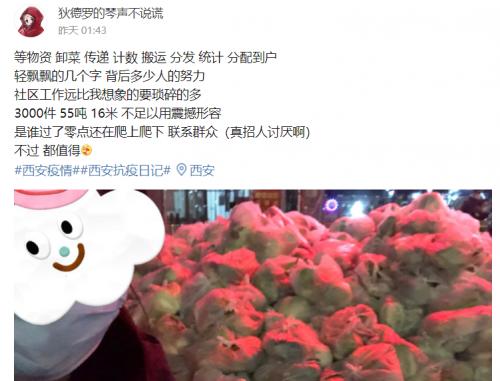 “等物资、卸菜、传递、计数、搬运、分发、统计、分配到户,轻飘飘的几个字背后多少人的努力,社区工作远比人们想象的要琐碎的多。”微博网友@狄德罗的琴声不说谎记录下了整个取菜的过程。而这样的抗疫故事在微博上还有很多。