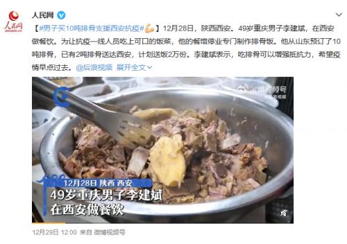 49岁重庆男子李建斌,在西安做餐饮。为让抗疫一线人员吃上可口的饭菜,他的餐馆停业专门制作排骨饭。他从山东预订了10吨排骨,已有2吨排骨送达西安,计划送饭2万份。李建斌表示,吃排骨可以增强抵抗力,希望疫情早点过去。