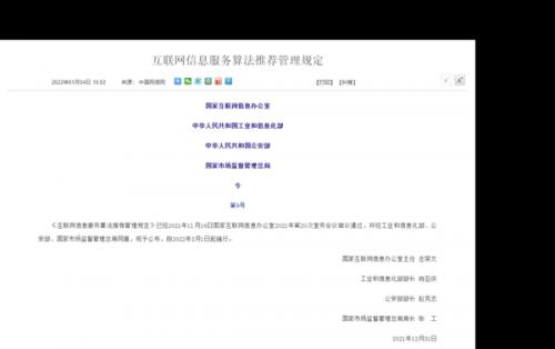随着互联网的大力发展,在带来便利的同时,也滋生出了算法歧视、“大数据杀熟”、诱导沉迷等算法等乱象。1月4日,国家互联网信息办公室、工业和信息化部、公安部、国家市场监督管理总局四部门联合发布《互联网信息服务算法推荐管理规定》,自2022年3月1日起施行。