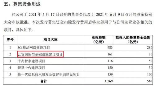 而此次募资扣除发行费用后,也将全部用于5G精品网络建设、云资源新型基础设施建设、千兆智家建设、智慧中台建设以及新一代信息技术研发及数智生态建设项目,总投资金额将达1569亿元。