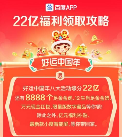 1月22日0点,百度APP的“好运中国年”活动正式开启,八大活动壕分22亿,8888个足金金虎、12生肖足金金饰、万元现金红包、限量版数字藏品等你领,除此之外,亿元福利补贴、最新款小度智能屏也在等你带回家。下面,我们来为大家分享一下百度活动的玩法,帮助大家最快集齐好运卡,赢取现金红包。