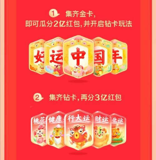 1月22日至1月31日,玩法一、集齐“好运中国年”金卡,即可瓜分2亿红包,并开启钻卡玩法,截至发稿,已有15人集齐;集齐钻卡,再瓜分3亿红包;集齐2-4套钻卡,钻卡奖金翻2-4倍;玩法二、前6666名集齐金卡、前1888名集齐钻卡可额外获得限量足金金虎,指定楼层集齐也可获得;金卡抽足金金饰,卡片越多中奖几率越高;玩法四、金卡投注,赢1000元现金,多投多中。此外,还有团圆红包分5亿、冰雪运动会分5亿、搜索分千万、1亿春节福利天天领、1亿补贴、补贴3亿SVIP特惠购、2亿特惠小度智能屏的活动参与。