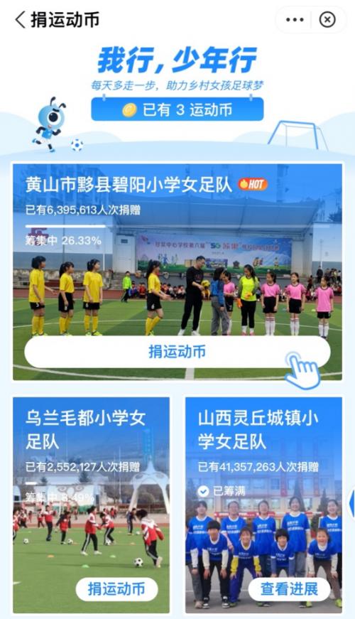 2019年起,支付宝运动小程序发布上线,网友可通过日常积累步数并捐出“运动币”参与支持相关项目,所有捐出的“运动币”,支付宝公益基金会将按一定比例捐赠资金,支持具体项目实施。截至当前,小程序已上线了包括“追风计划”等在内的45个足球发展相关的公益项目,为乡村学校捐赠了24个足球场,还支持了云南、四川、甘肃、山西等多个省份的女子足球队或青训中心。