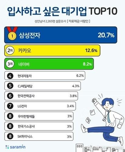 2月14日消息,据韩联社报道,韩国就业门户网站Saramin今天公布了一份调查数据,其中显示,在最想入职的大企业排行榜中,三星电子(20.7%)位居第一,其后依次是互联网巨头KAKAO(12.6%)、门户网站NAVER(8.2%)、现代汽车(6.2%)、CJ第一制糖(4.3%)、韩国电力公社(3.8%)、LG电子(3.4%)、优雅的兄弟(3%)、韩国天然气公社(3%)、SK海力士(3%)等。