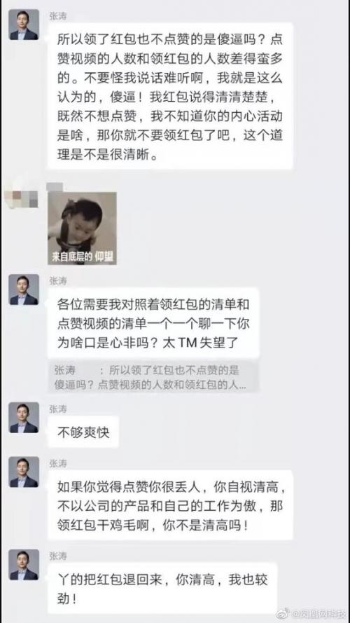 据悉,张涛在公司微信群内发布了一个产品宣传视频,并给大家发了一个红包,要求员工领红包后为视频点赞。结果,领取红包的人比视频点赞更多。为此,张涛直接辱骂了那些领红包不点赞的员工,并要求不点赞的员工退还红包。聊天记录显示,张涛在群里表示,“我说得清清楚楚,既然不想点赞,我不知道你的内心活动是啥,那就不要领红包,这个道理是不是很清晰。”