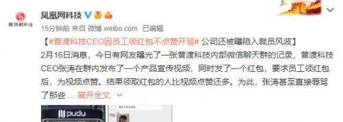 领红包本是一件让人开心的事情,但有时候也会产生一些纠纷。CNMO接下来要说的这件领红包的事,大家估计闻所未闻。2月16日,据凤凰网科技报道,有网友曝光了一张普渡科技内部微信群的聊天记录截图,该公司CEO张涛因员工领完红包后不给视频点赞,怒而在群里开骂。
