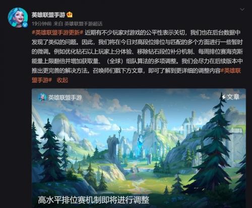 2月24日,《英雄联盟手游》官方宣布,将进行全球一致的匹配体验调整,提升高水平排位赛中单人玩家的游戏体验。更新后,部分钻石、大师、宗师和王者段位的玩家,在对局胜利之后将获得更多的胜点,在对局失败之后也将扣除更少的胜点。原先需要补分的钻石段位玩家不再出现赢一局获得的胜点低于输一局扣除的胜点的情况。每周排位赛海克斯能量上限翻倍,同时增加获取量。